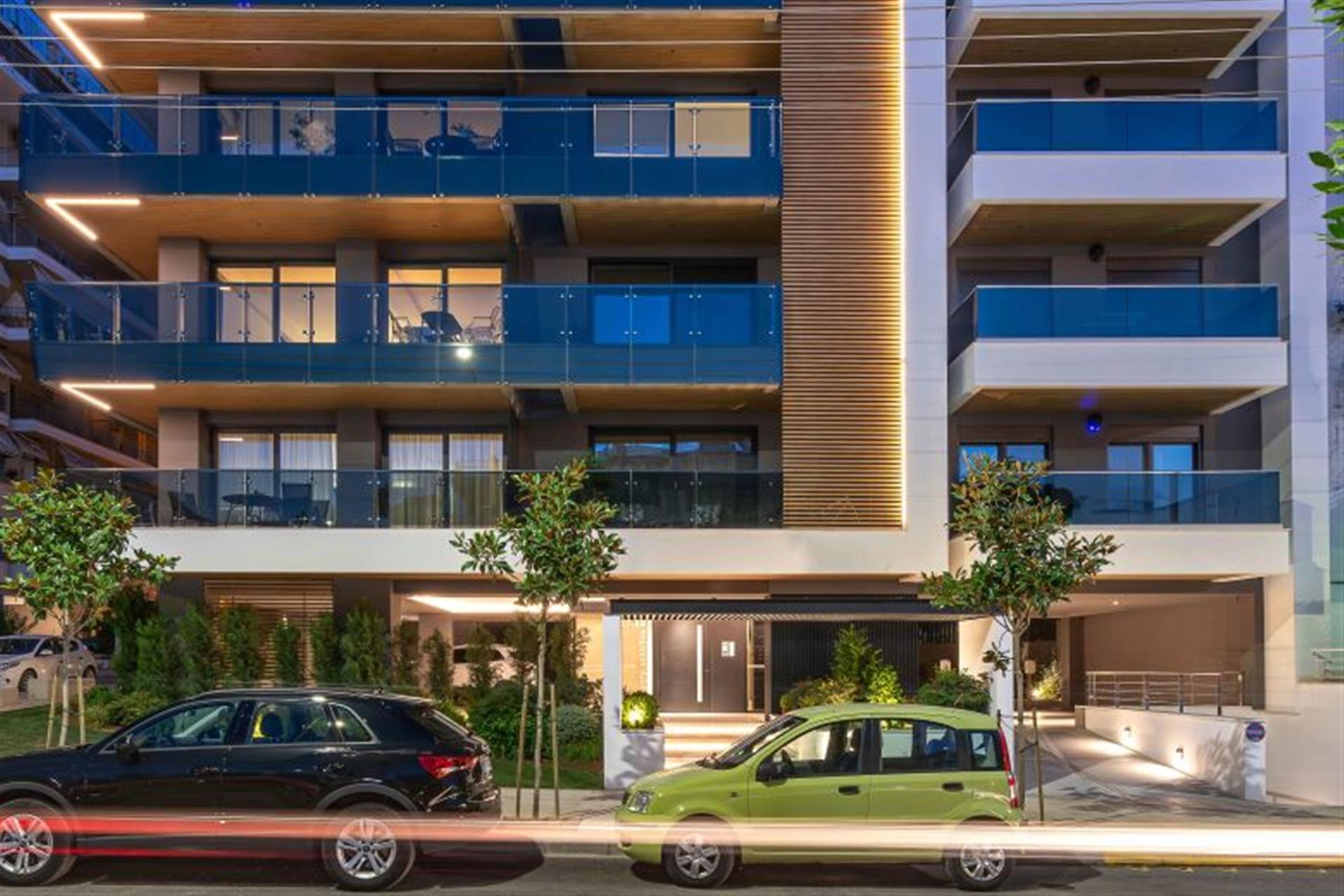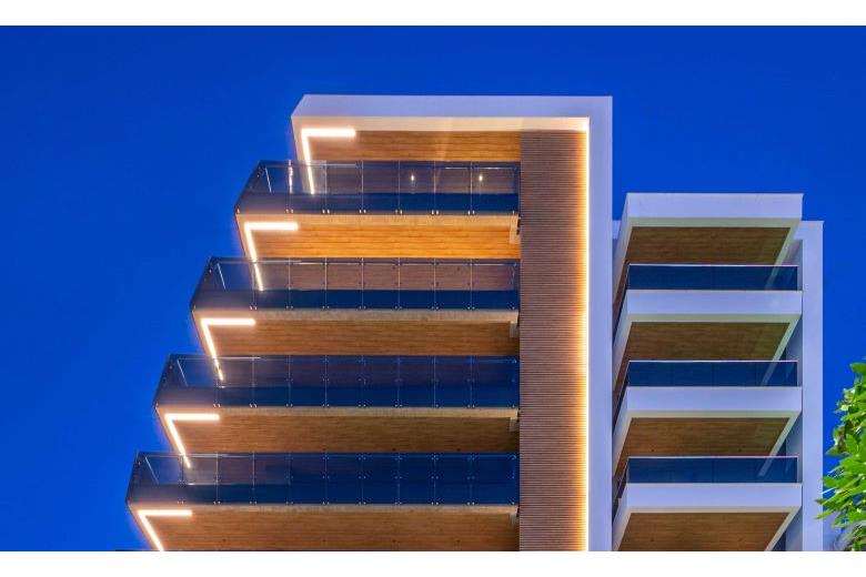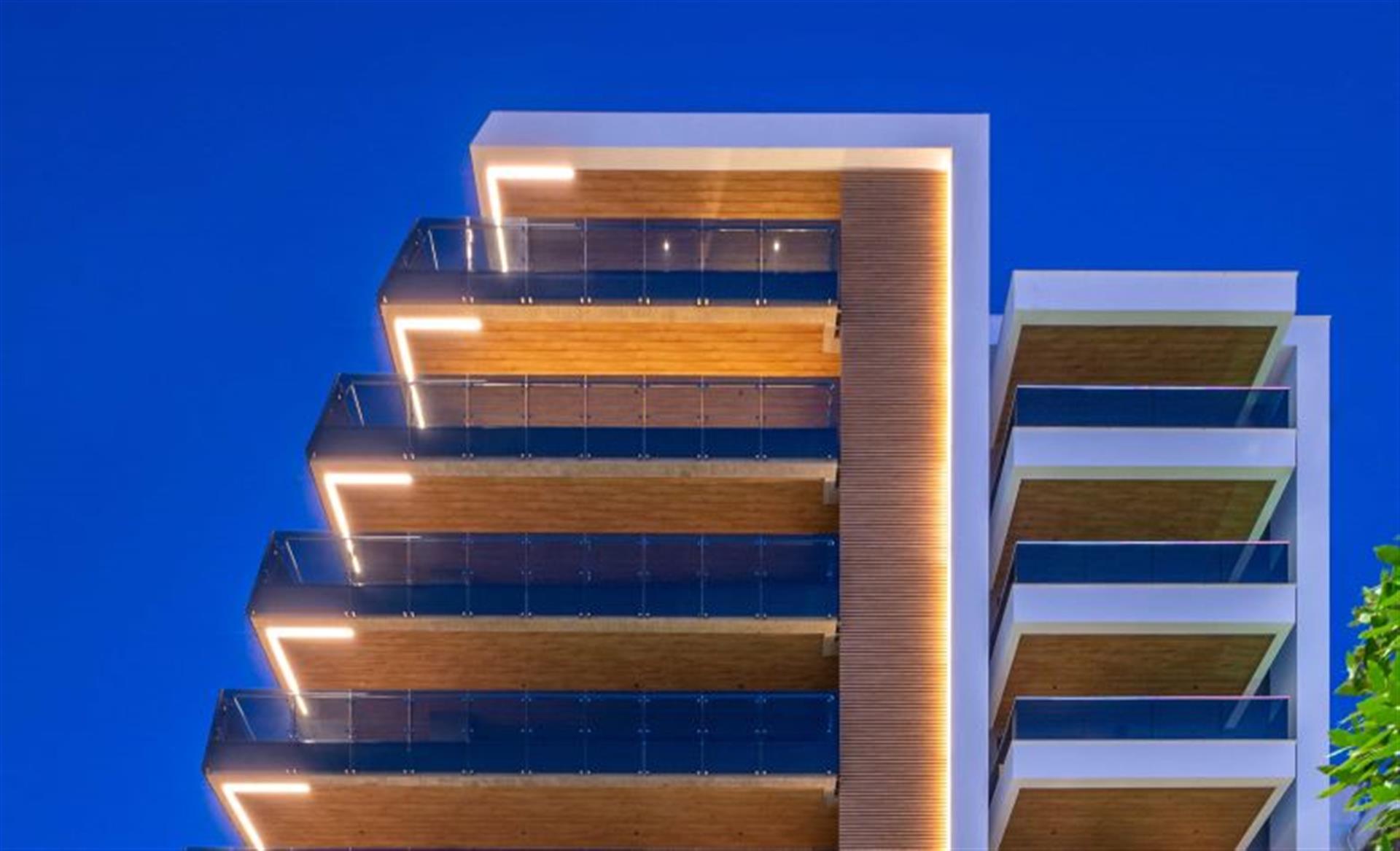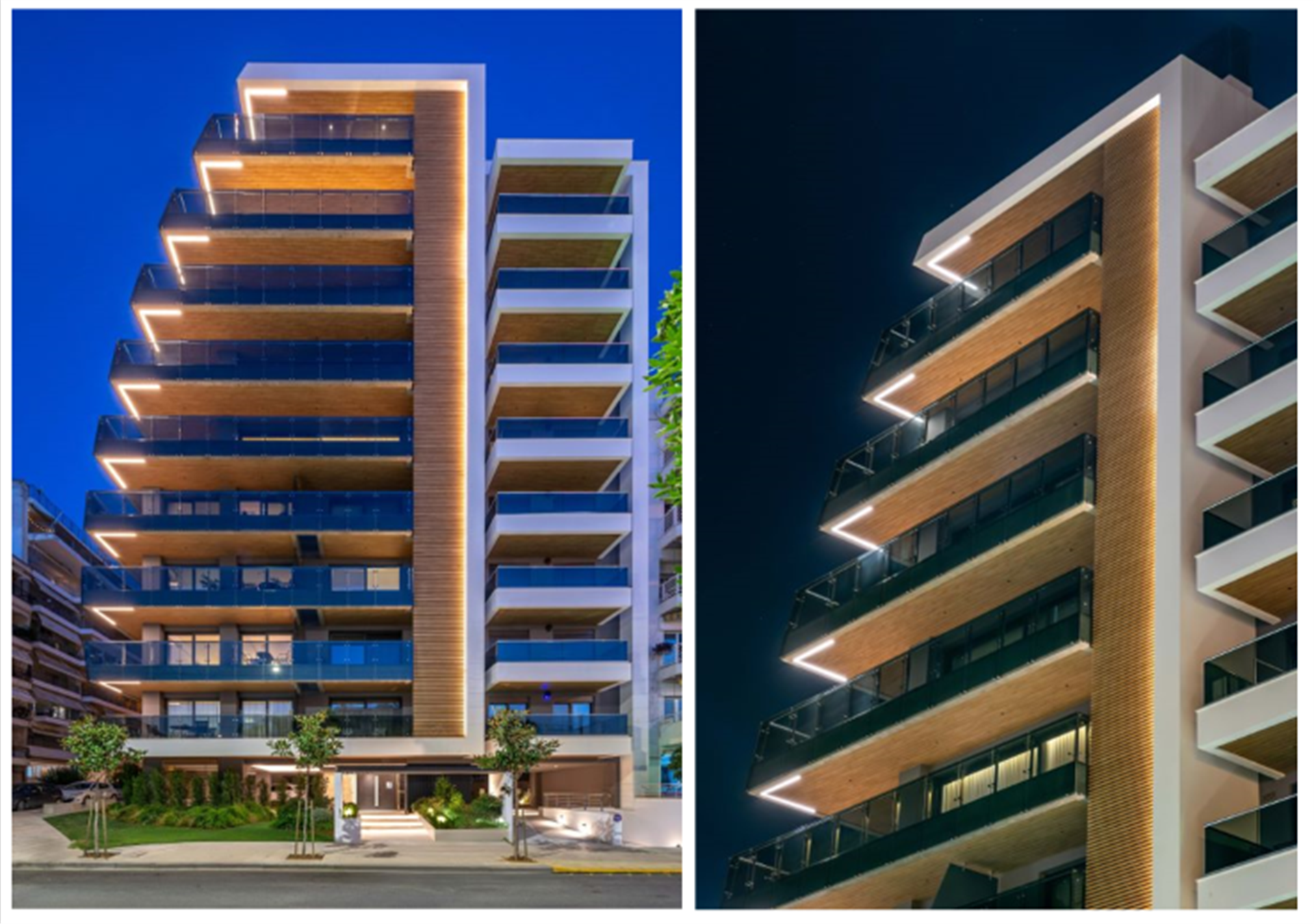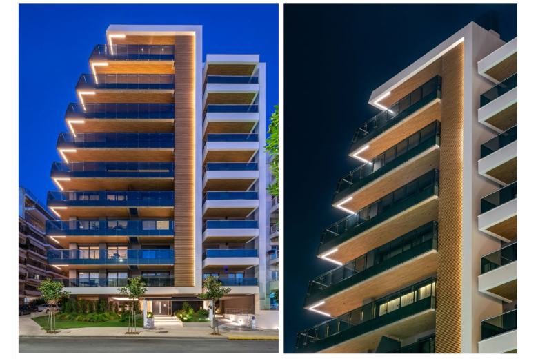 Discreet yet impactful, the outdoor lighting of the 8-storey apartment building in Kalamaria, Thessaloniki enhances the architectural geometry while ensuring visual comfort and safety. With a focus on soft contrasts and precision, the design highlights the building's clean lines and natural textures, integrating seamlessly into the residential environment.
