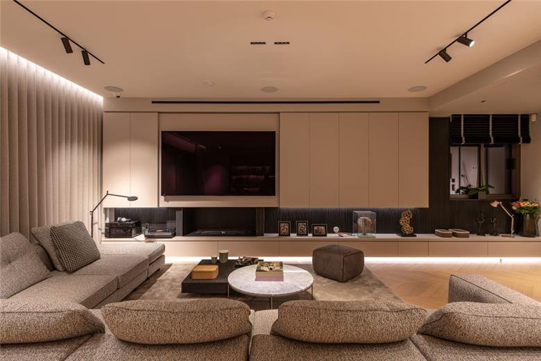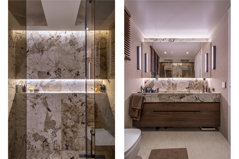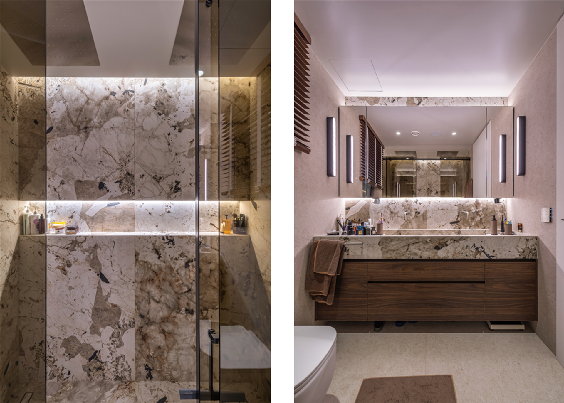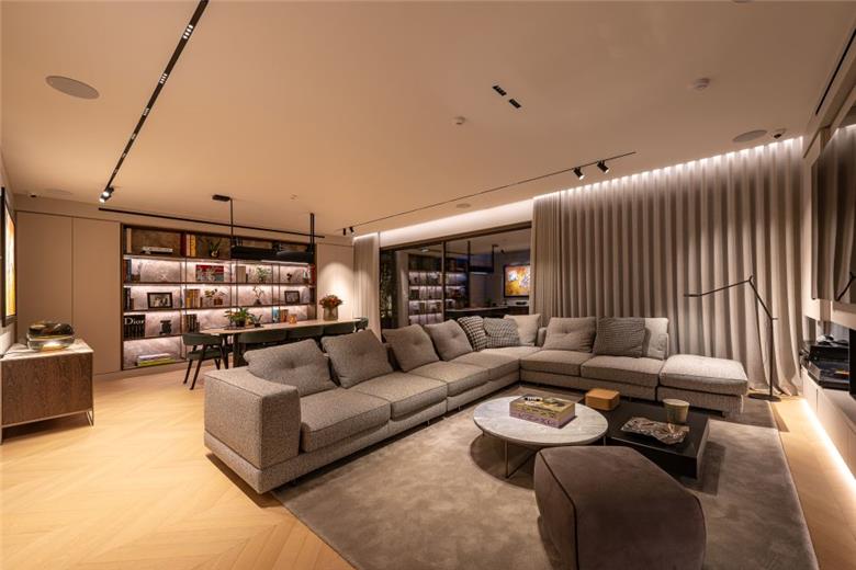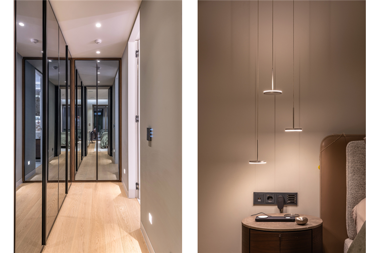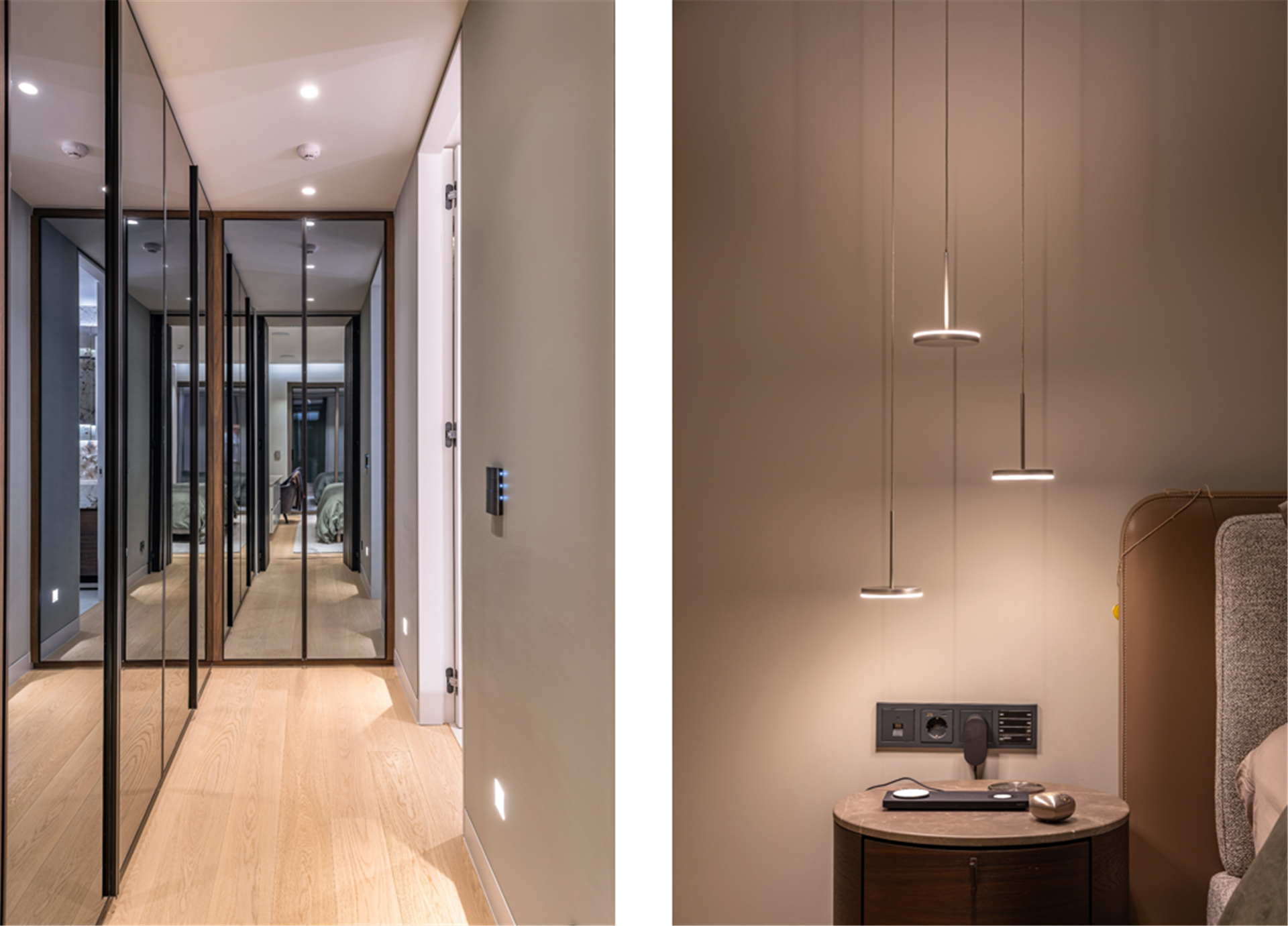 A DALI system allows seamless general and individual control, enabling tailored lighting scenarios that respond to the daily life of the family. The design strategy embraces a triple purpose: enhancing the apartment's luxury aesthetic, establishing an ambient and comfortable environment, and fulfilling the practical lighting needs of each space.