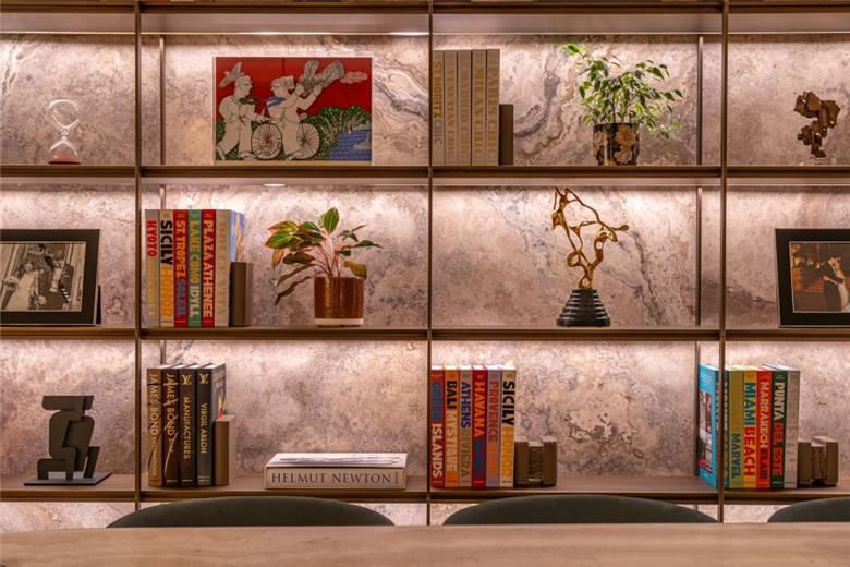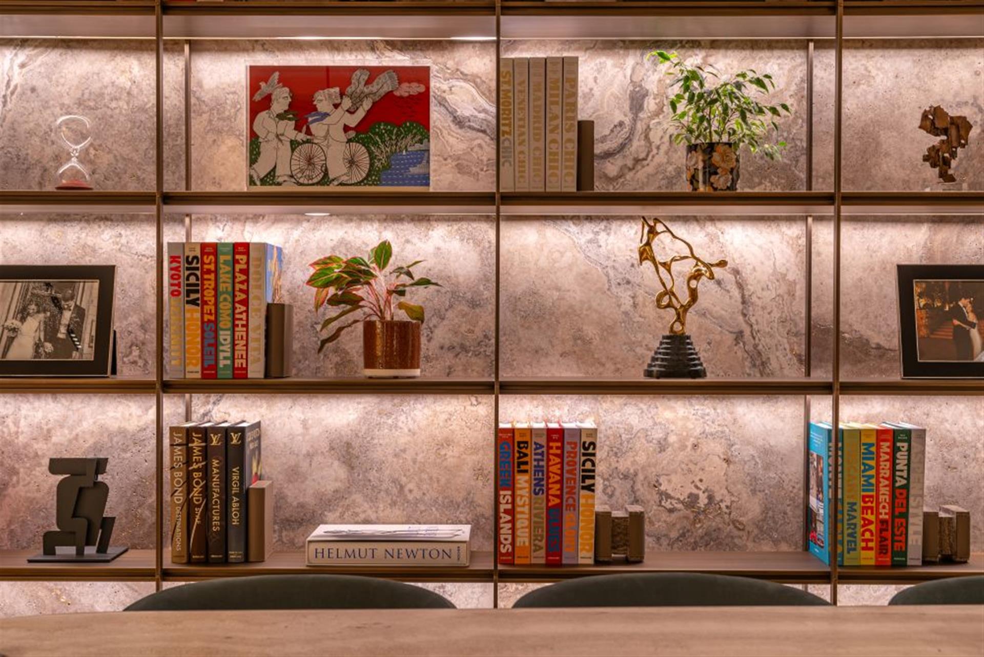 Track and linear recessed lighting systems deliver visual comfort and defining spatial continuity across the sophisticated living and dining areas. Complemented by concealed LED strips throughout the living and dining area, create a warm and inviting atmosphere providing visual comfort throughout. The integrated spotlights highlight key art pieces thought the residence. In the library, LED strips accentuate the textured background and the curated objects, transforming this area into a striking centerpiece upon entering the residence.
