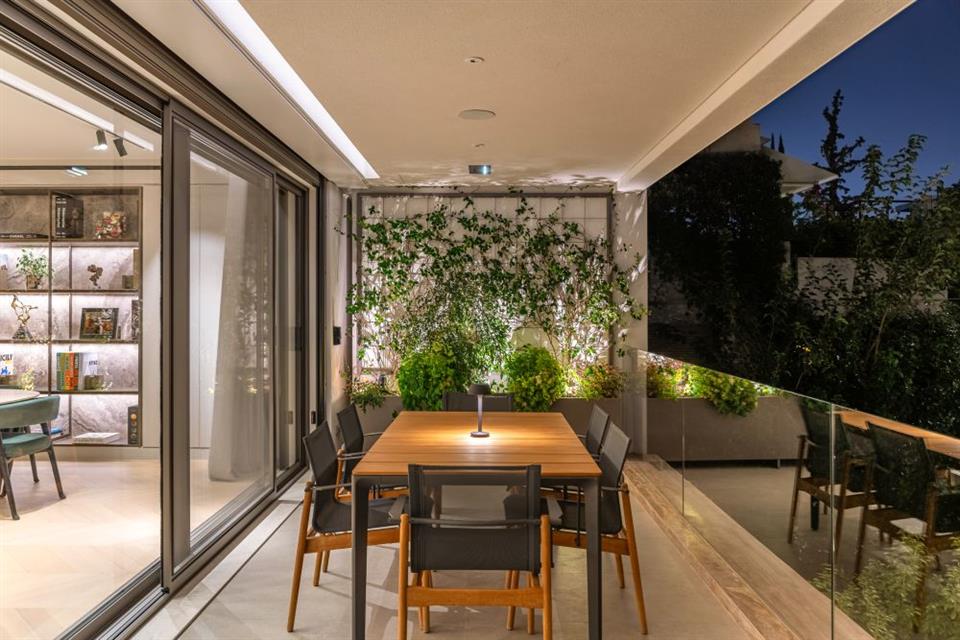 The lighting design of this luxury residence in Filothei, Athens, creates a welcoming and contemporary atmosphere, where every element enhances both the premium aesthetic and the functional experience of the space for a family of four.