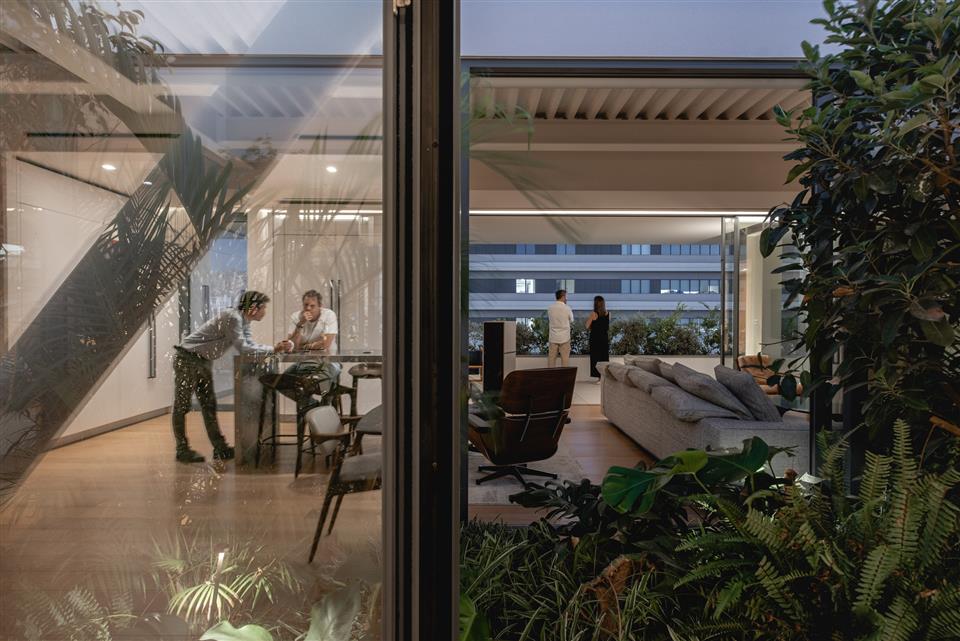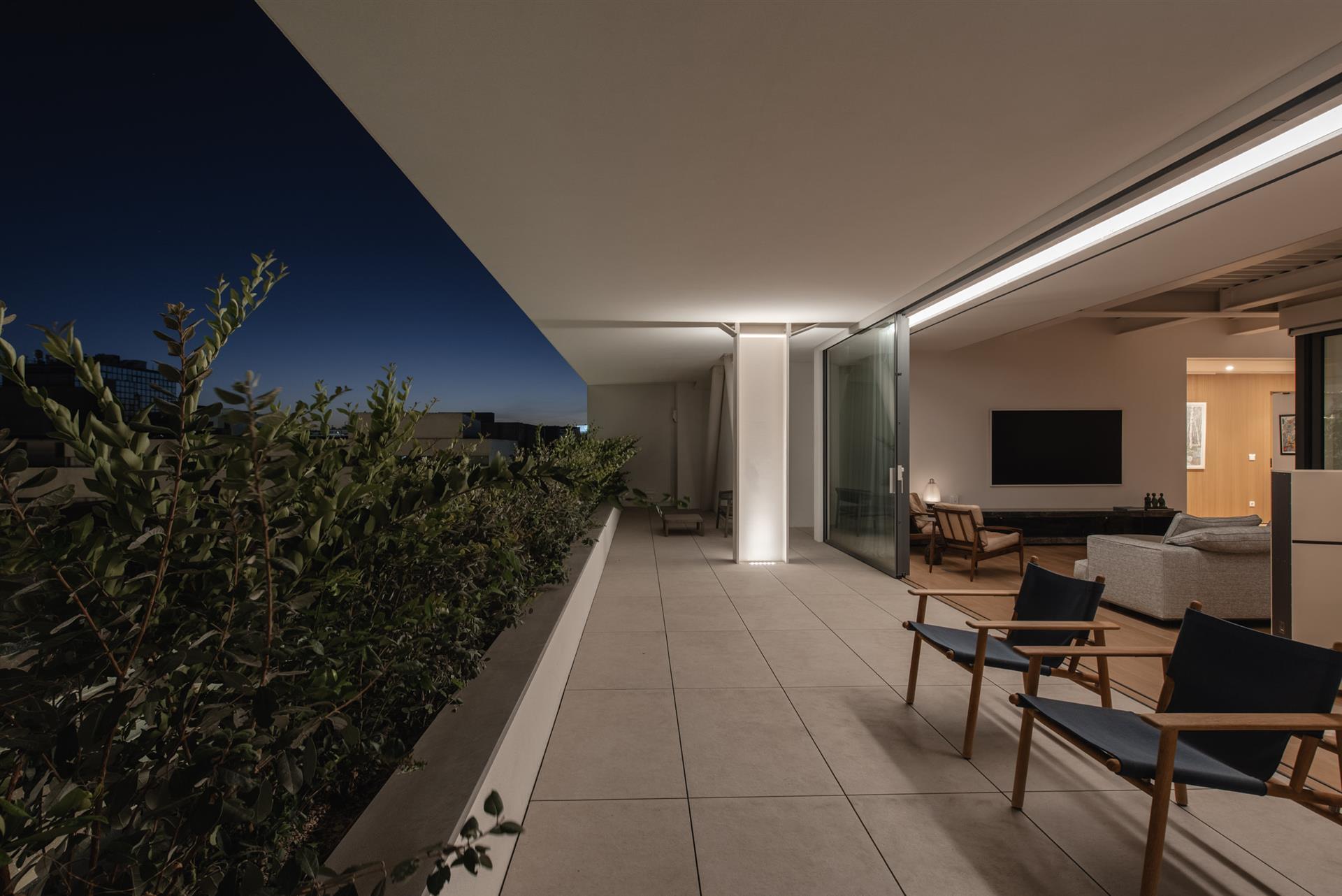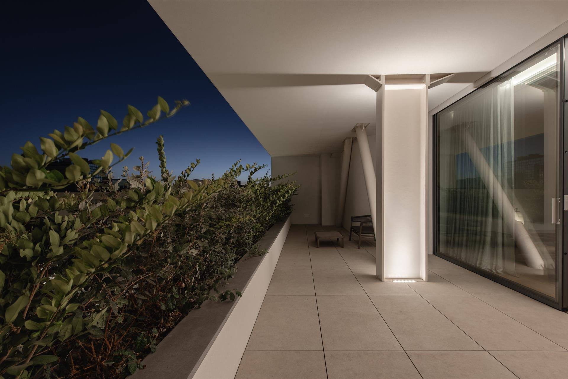 The outdoor garden at the heart of the penthouse is illuminated with delicacy, in complete harmony with the interior. Low-level fixtures enhance the terrace and planting, giving them depth and presence after dark, while recessed ceiling luminaires light the building's facade with restraint, creating a unified composition of architecture and nature.