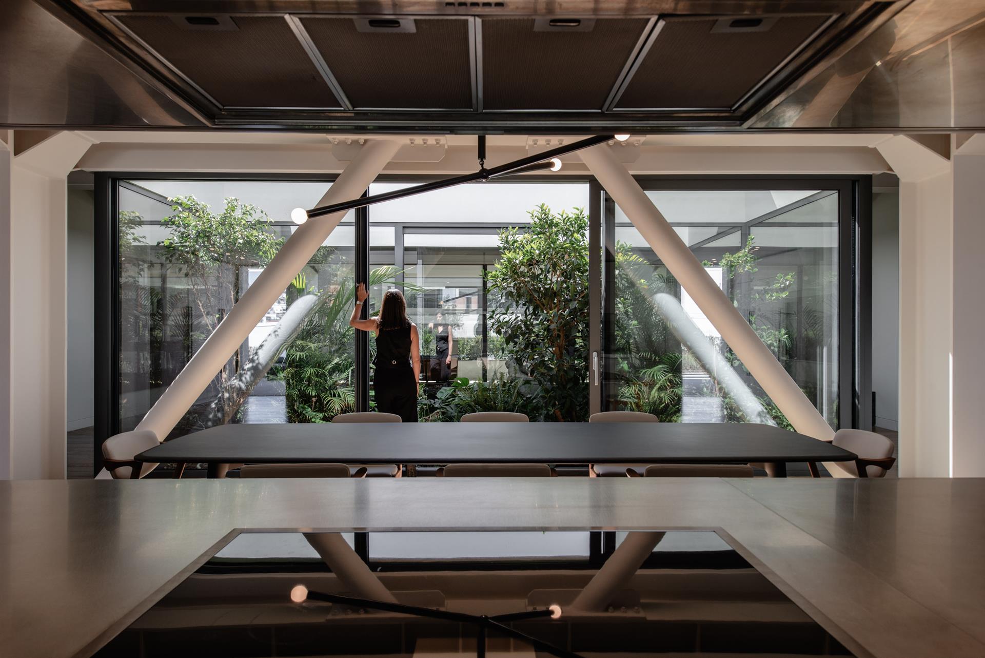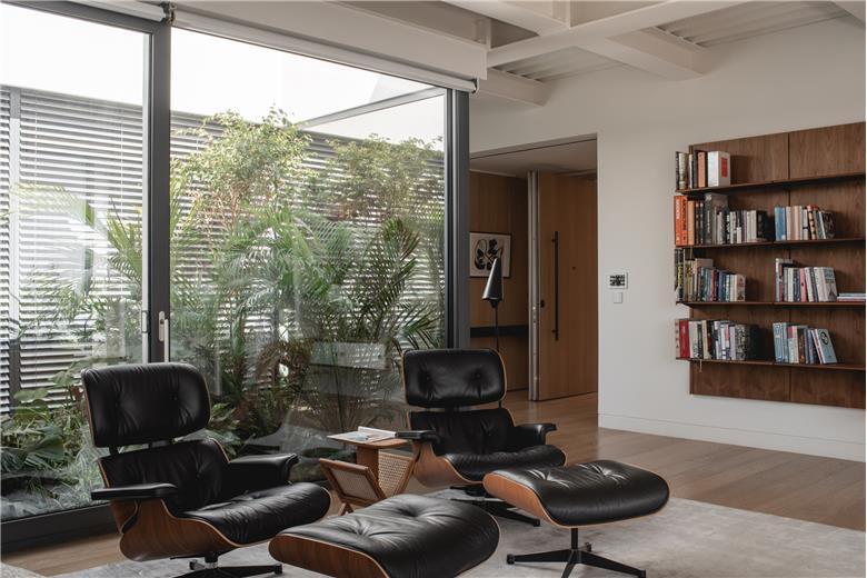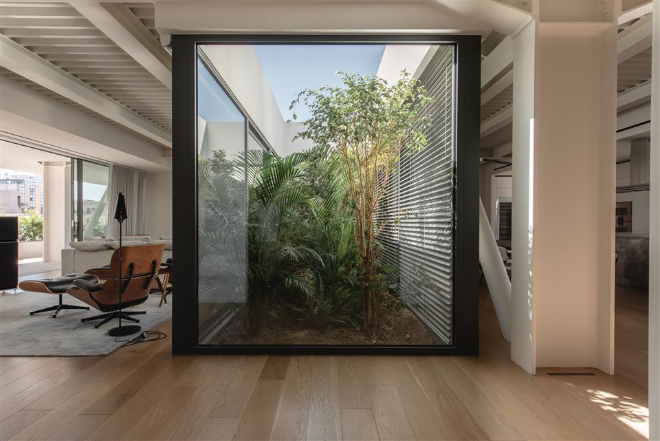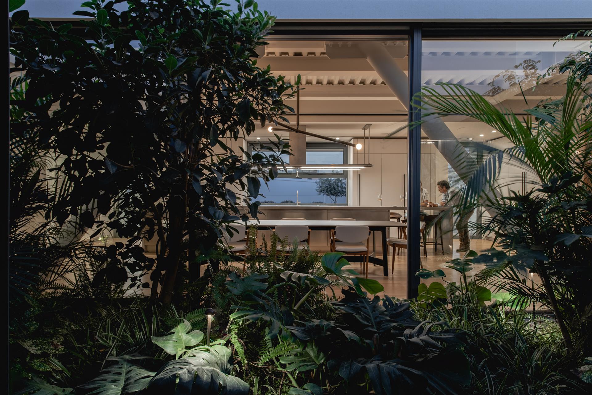 The outdoor garden at the heart of the penthouse is illuminated with delicacy, in complete harmony with the interior. Low-level fixtures enhance the terrace and planting, giving them depth and presence after dark, while recessed ceiling luminaires light the building's facade with restraint, creating a unified composition of architecture and nature.